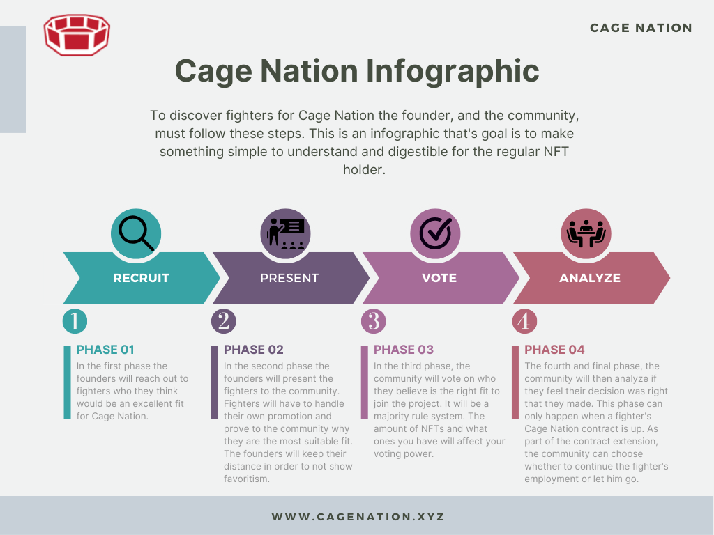After recruiting enough fighters for Cage Nation, Step two begins. In this step, we will be trying to get sponsorship deals that will benefit our fighters and the community as a whole. The hope is that we can introduce revenue sharing at this stage, using an 80/20 percent revenue sharing model. This is 80% allocated to fighters and 20% to NFT holders. However, we are unsure what it will look like with legal issues dealing with revenue sharing. The founders are currently in talks with lawyers to figure out the best approach to ensure Cage Nation's longevity.
